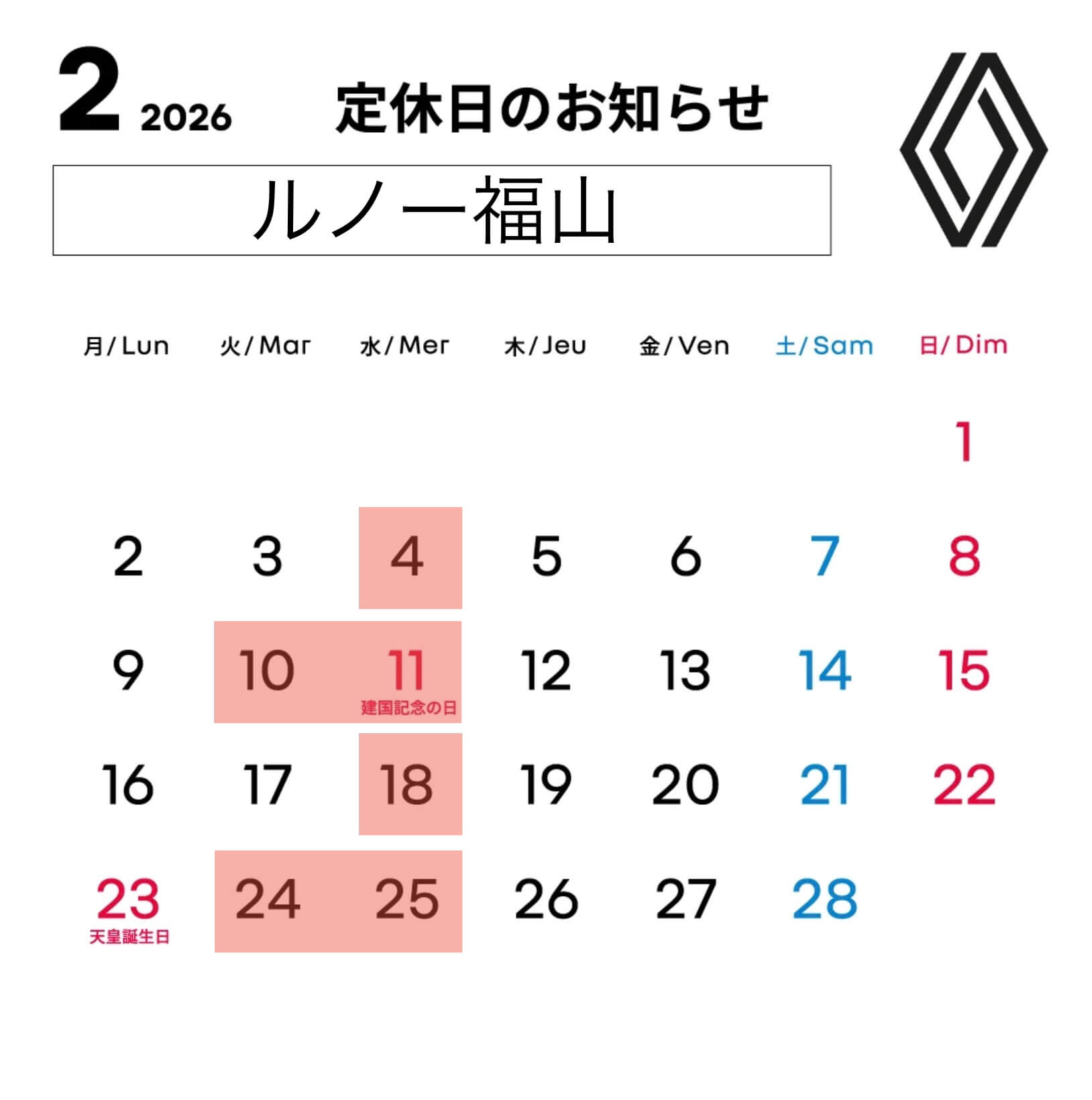 2月営業日のご案内 2026.01.22.Thu INFO Tweet シェア こんにちは!ルノー福山です! 今朝は展示車にうっすら雪が残っていた福山市内です! 最強寒波到来とのことで、日差しがあっても外は冷凍庫のようです(;゚Д゚) さて、来月の営業日カレンダーのご案内です! 皆さまのお越しをお待ちしております(^O^)/ 試乗申込はこちら カタログ請求はこちら