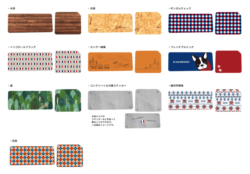 個性あふれる全10種類のデザインから選んで、自由にカングーをデコっちゃいましょう!