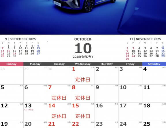 2025年9月 定休日のお知らせ 2025.08.29.Fri INFO 【車検】 入庫希望日の1ヵ月前までのご予約で”早期予約割引”を適用いたします。また、代車をご希望の場合はご相談ください。 早めのご予約をお待ち申しております。 【点検】 点検のご入庫に際しましては、ご... MORE