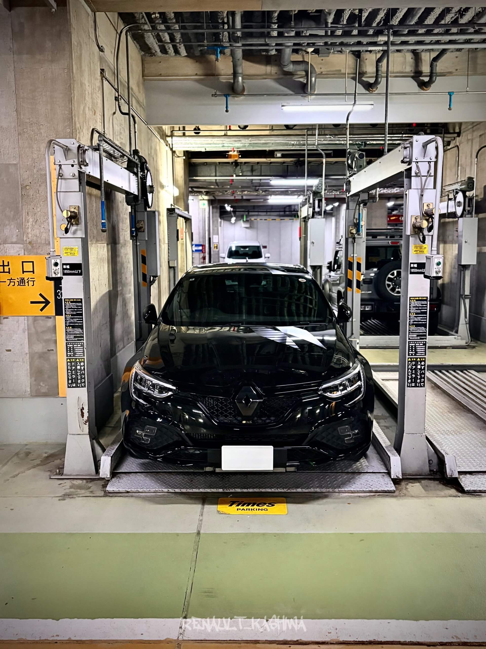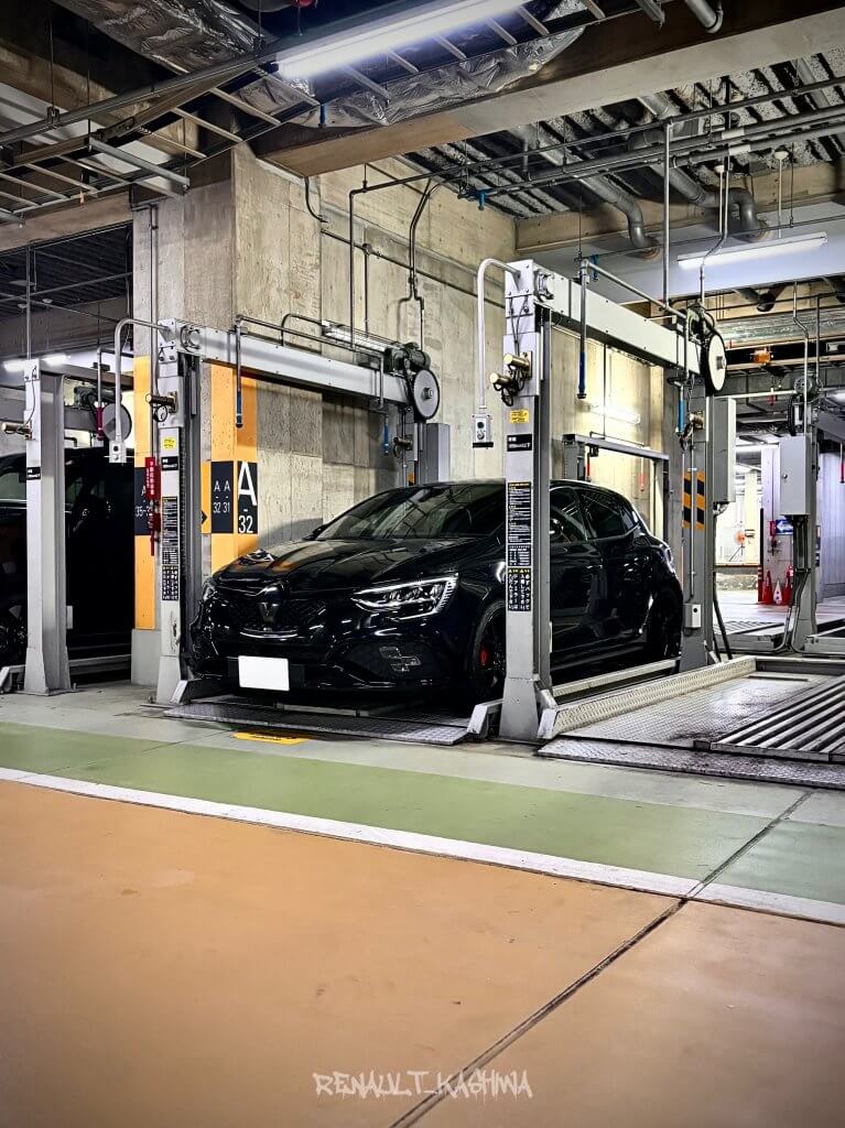 誕生日ディナーを楽しんだ合間の一枚で、機械式駐車場のパレットに収まったメガーヌがかっこよくでパシャリ📸