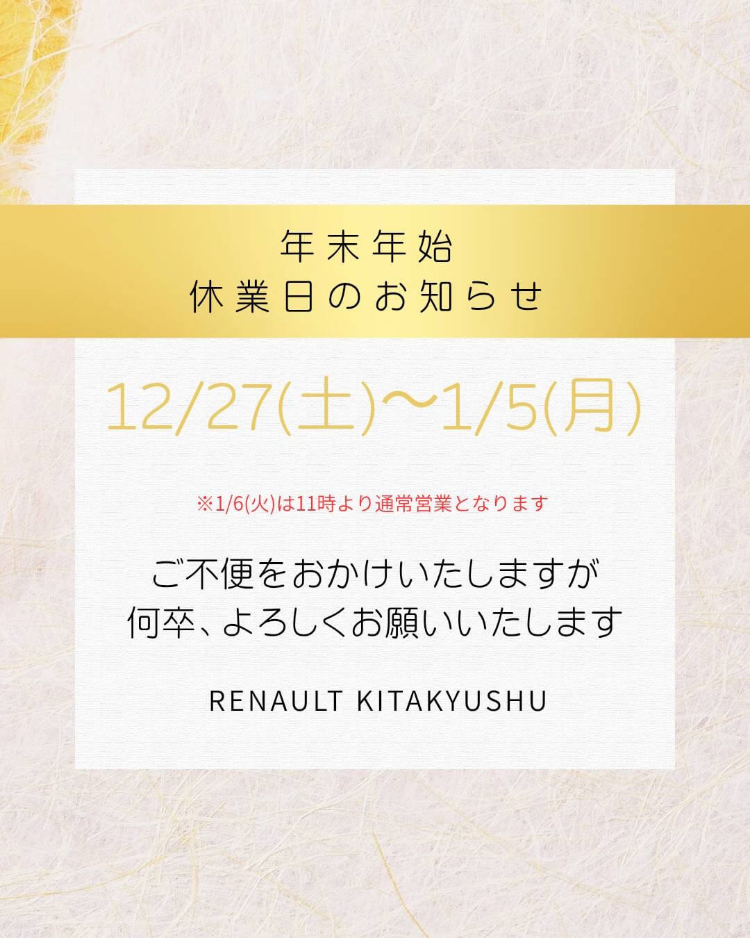 年末年始休業のお知らせ 2025.12.26.Fri INFO Tweet シェア 平素よりルノー北九州をご愛顧賜り 誠にありがとうございます。 誠に勝手ながら、ルノー北九州では 下記の日程を年末年始休業とさせていただきます。 【店休日】 12月27日(土)~1月5日(月) 2026年1月6日(火)11時より 通常営業致します。 ◇◆休業期間中/緊急連絡先◇◆ JAFロードサービス 0570-00-8139(全国共通) 092-841-5000(福岡救援コール) ルノー・アシスタンスサービス 0120-153-365 試乗申込はこちら カタログ請求はこちら