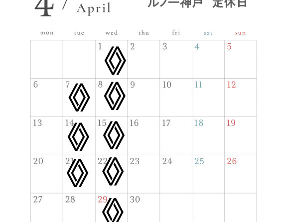 4月定休日のお知らせ 2026.03.31.Tue INFO みなさん、こんにちは! ルノー神戸のサワイです。 4月の定休日をお知らせいたします! なお、今月の限定ドリンクはレモンジンジャーティーです! ご来店おまちしてま~す! MORE