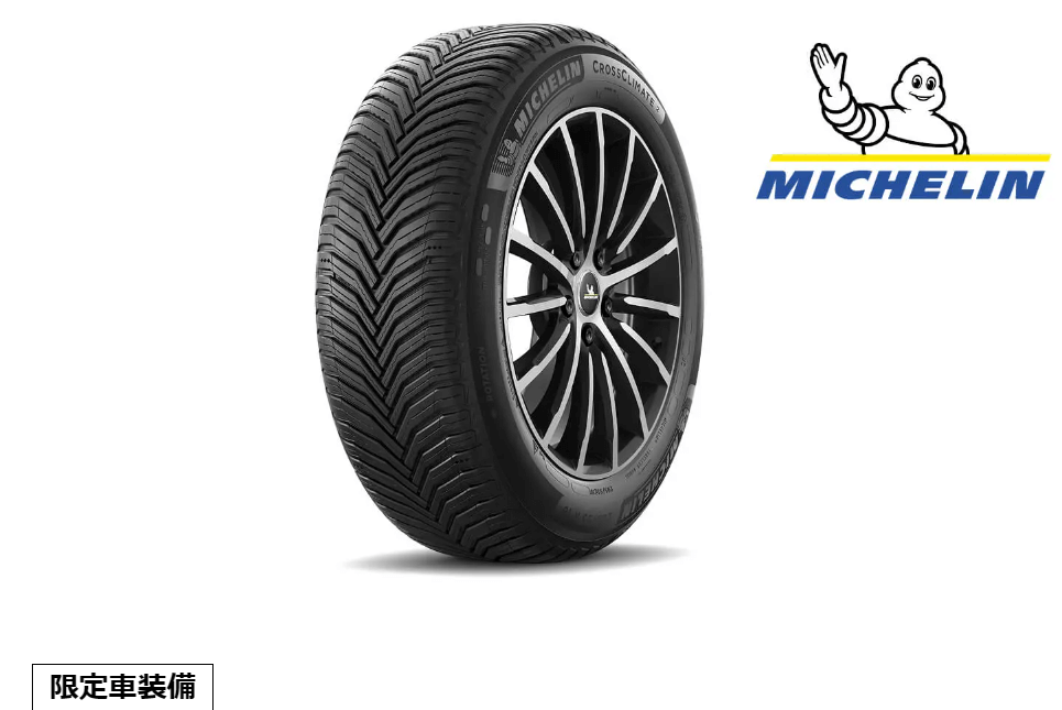 ミシュラン社製のオールシーズンタイヤ「クロスクライメート2 (CROSSCLIMATE 2)」。このタイヤは、乾燥路、湿潤路、そして雪道まで一年を通じて高い性能を発揮するよう設計されています。 夏タイヤ同等のドライ・ウェット性能と、冬用タイヤとして認証された雪上性能(3PMSFマーク付き)を両立させた「全天候型タイヤ」です。