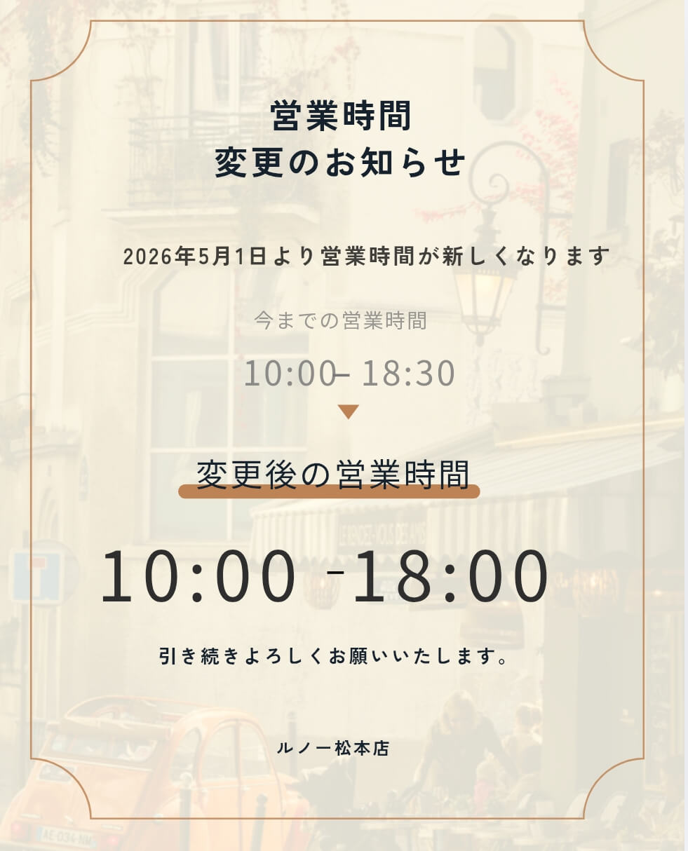 2026年5月1日より、店舗の営業時間を下記の通り変更いたします。
