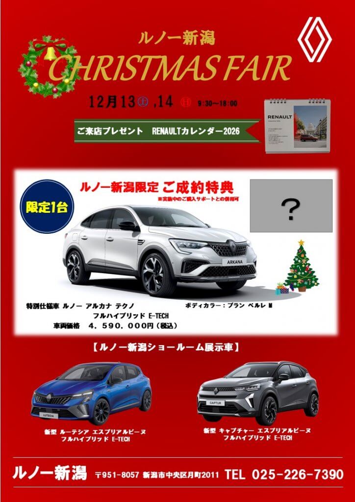 明日12月13日(土)、14日(日)は「ルノー新潟 クリスマスフェア」