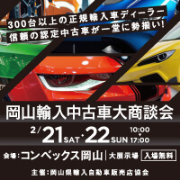 岡山輸入中古車大商談会開催! 2026.02.12.Thu INFO 2月21日(土)、22日(日)にコンベックス岡山 大展示場にて、 『岡山輸入中古車大商談会』が開催されます。 岡山県の正規輸入車ディーラーが終結! 300台以上の信頼の認定中古車が一堂に勢揃いします!... MORE