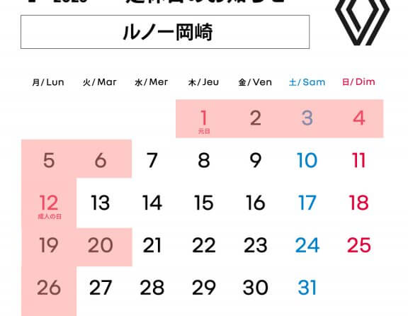 【冬期休暇】12/29~1/6【1/7(水)15時より】 NEW 2025.12.28.Sun INFO 早いもので2025年も終わりを迎えます。お陰様で無事に今年を終えられそうです。支えて頂いた皆様、ありがとうございました! さて、画像にある通り、ルノー岡崎始めガレージ新和グループは12/29-1/6ま... MORE