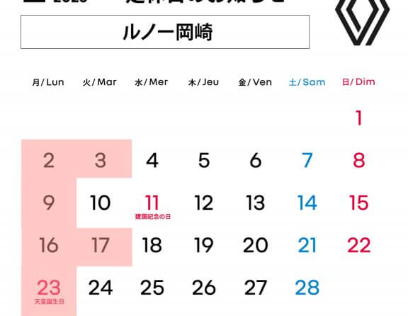 【冬期休暇】12/29~1/6【1/7(水)15時より】 2025.12.28.Sun INFO 早いもので2025年も終わりを迎えます。お陰様で無事に今年を終えられそうです。支えて頂いた皆様、ありがとうございました! さて、画像にある通り、ルノー岡崎始めガレージ新和グループは12/29-1/6ま... MORE