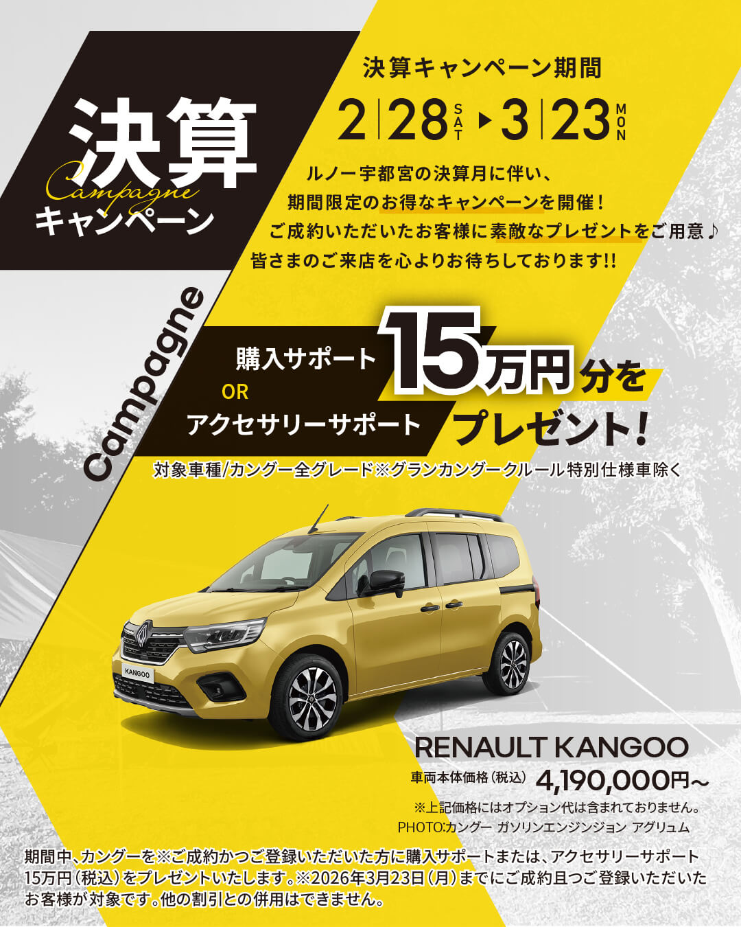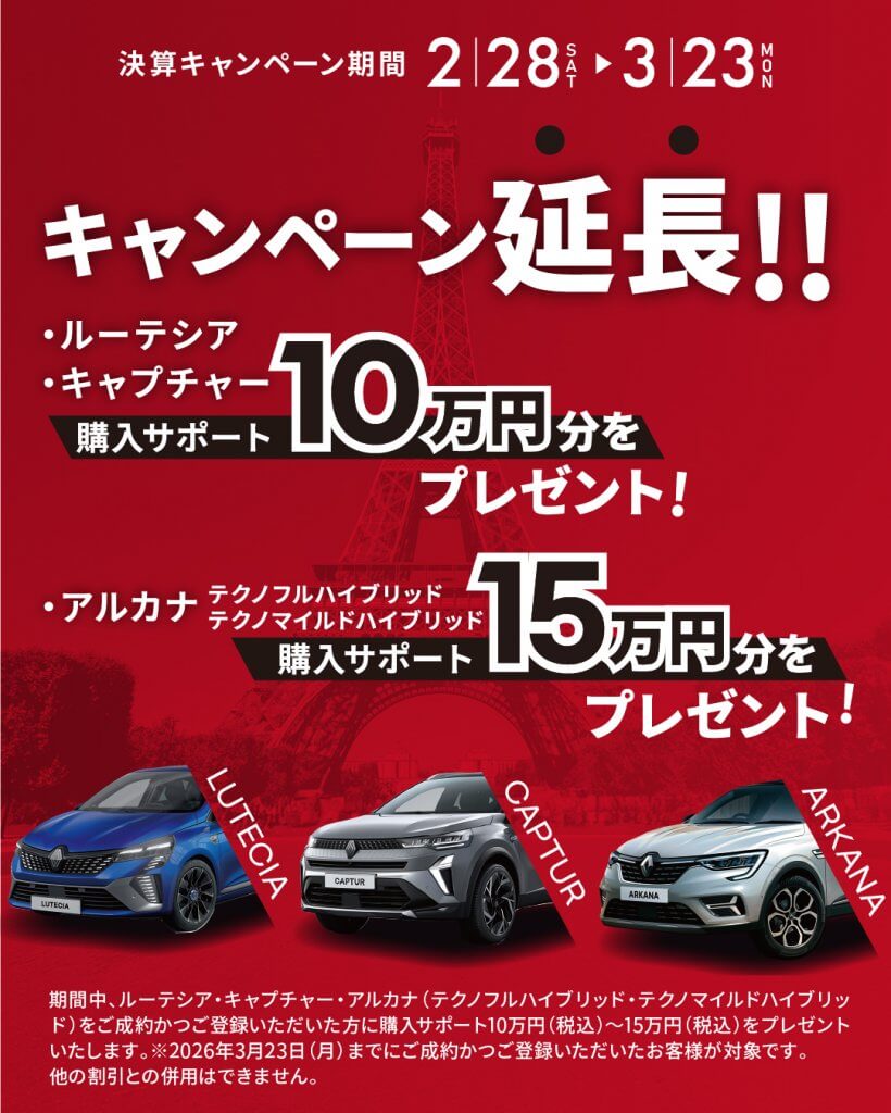 ルノー宇都宮の決算月に伴い、 2月28日(土)~3月23日(月)までお得なキャンペーンを開催いたします!