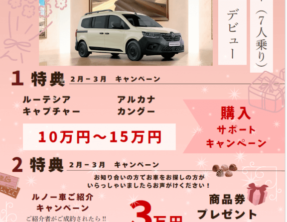 🚗キャンペーンのご案内🚙 2026.01.20.Tue INFO こんにちは!まだまだ寒い日が続きますが皆さまお元気でしょうか。⛄ 本日は『購入サポートキャンペーン』のご案内です✨ 2026年1月15日~2026年2月28日の期間に、ルーテシア、キャプチャー、アルカ... MORE