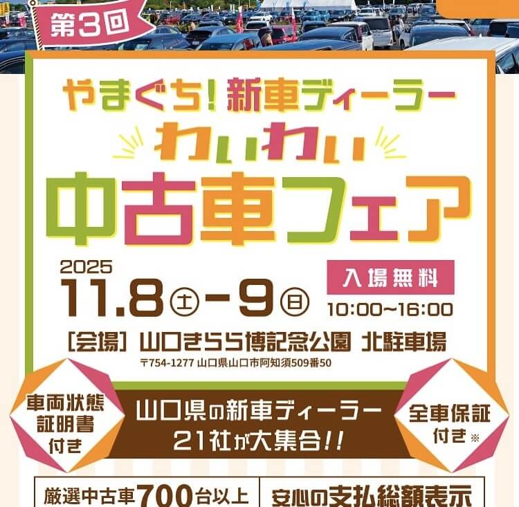 中古車フェア参加します🚗 NEW 2025.11.04.Tue INFO Tweet シェア こんにちは!朝晩が冷えるようになりましたね🥶 11月8日(土)、9日(日)は、山口きらら博記念公園にて「わいわい中古車フェア」が開催されます✨ 可愛いトゥインゴをはじめ、ルノー山口からは7台展示いたします! 様々なイベントもあるみたいなので、ぜひこの機会に見に来てください♪ わたがしエリアの近くでお待ちしております😊 試乗申込はこちら カタログ請求はこちら
